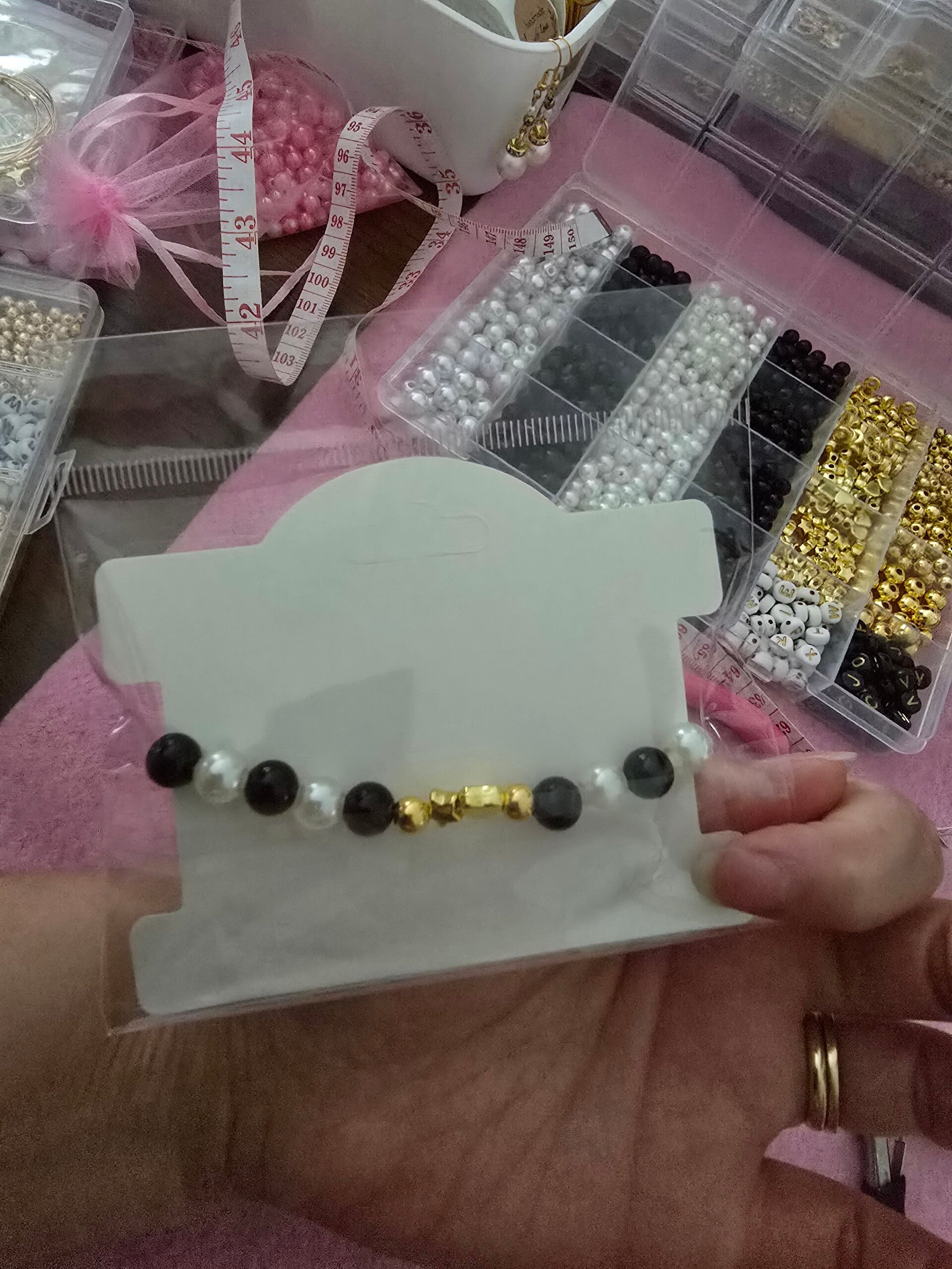 Isoja mustia ja valkoisia helmiä. Rakkaus teksti keskellä, takana kultaisia koruja.