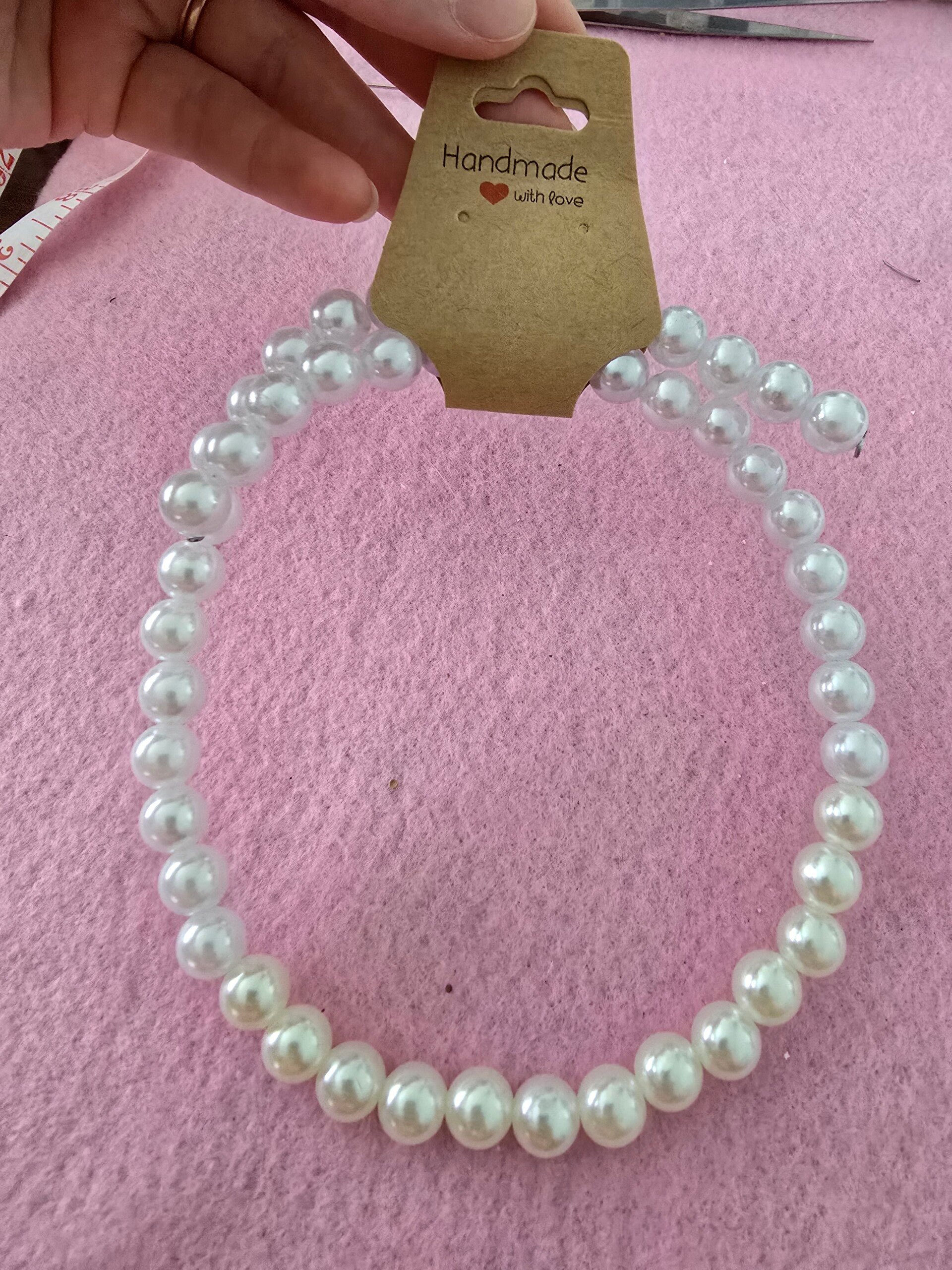 Isoista valkoisista helmistä tehty kaulakoru. Tehty koruvaijeriin