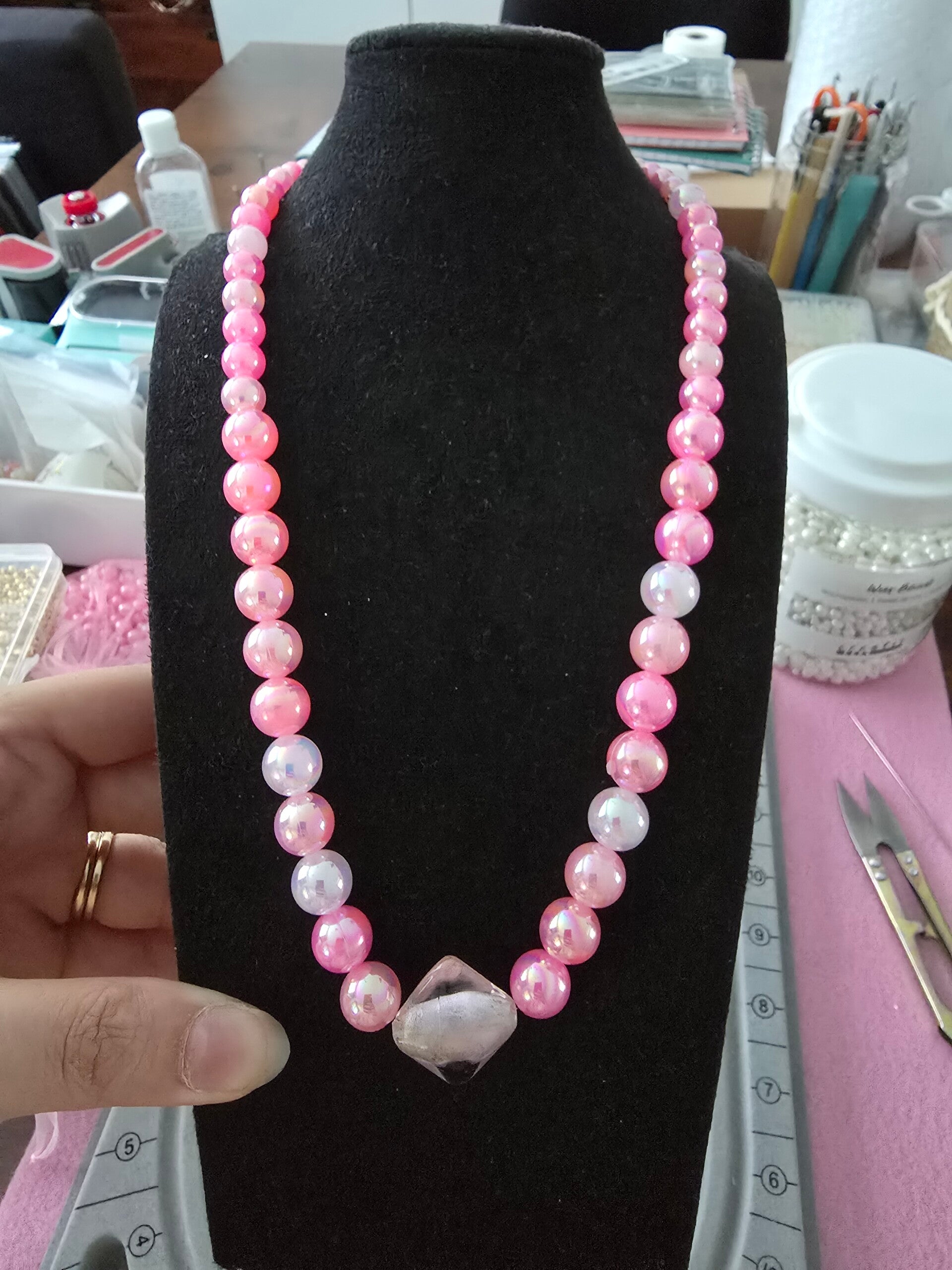 Erillaista pinkki helmistä tehty kaulakoru.